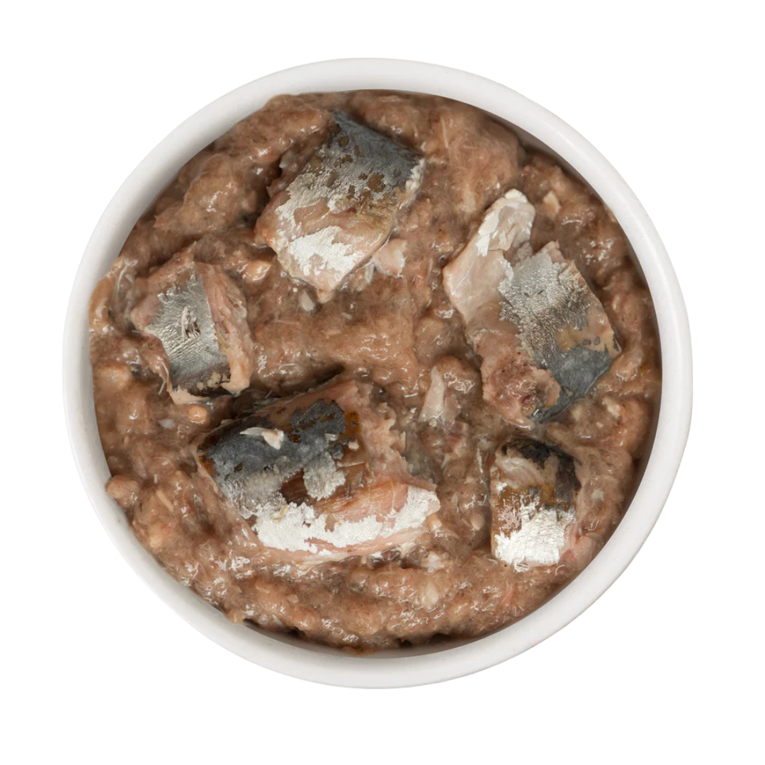 Caldo de pescado, salmón, atún, sardina, caballa, aceite de semilla de girasol, goma de algarrobo, goma guar, goma xantana, cloruro de potasio, aceite de pescado, cloruro de colina, taurina, sulfato de zinc, suplemento de vitamina E, ácido nicotínico (vitamina B3), pantotenato de calcio, mononitrato de tiamina (vitamina B1), proteínato de manganeso, suplemento de vitamina A, sulfato ferroso, suplemento de riboflavina (vitamina B2), clorhidrato de piridoxina (vitamina B6), ácido fólico, sulfato de cobre, complejo de bisulfito de sodio de menadiona (fuente de vitamina K), yoduro de potasio, biotina, suplemento de vitamina B12.