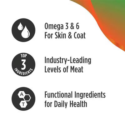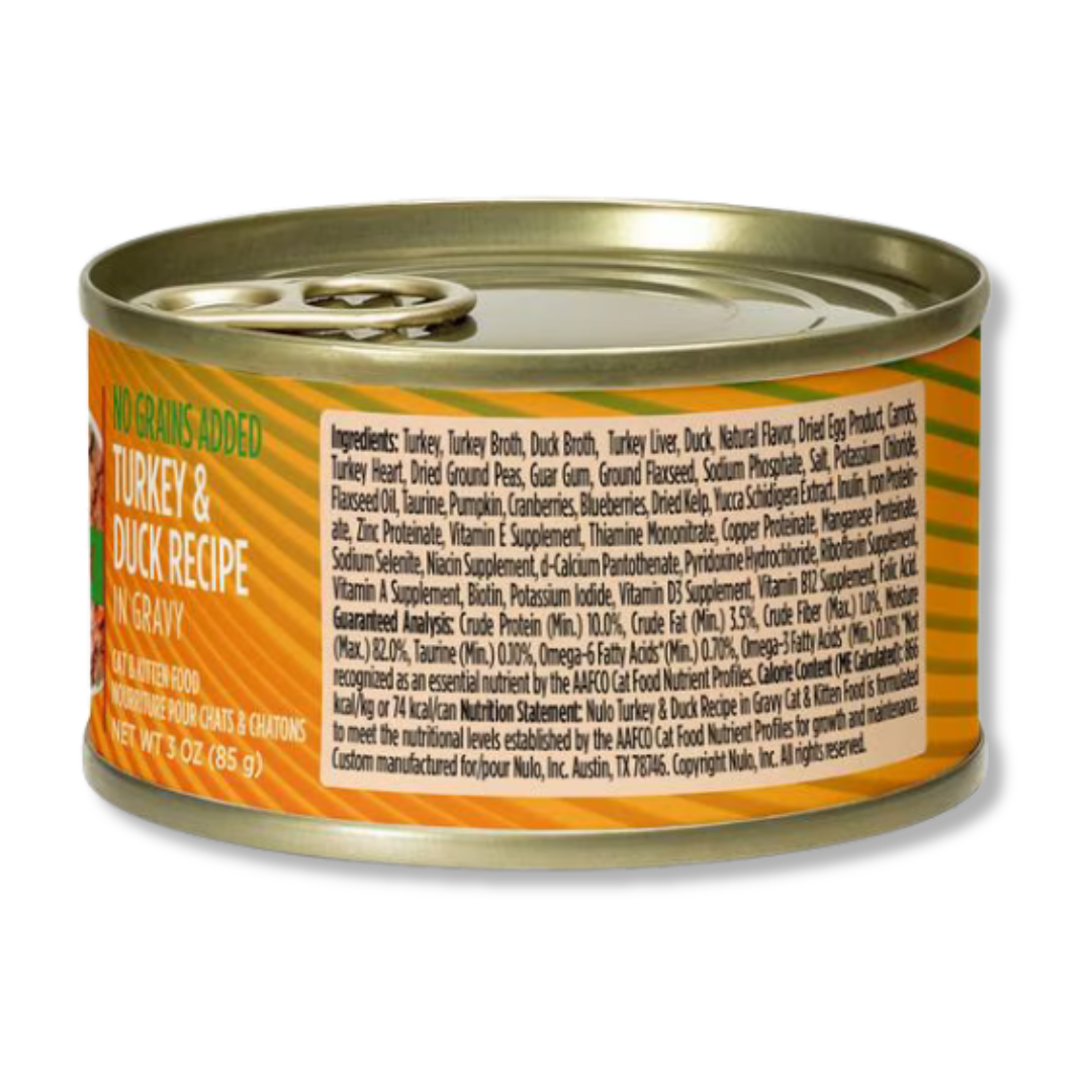 Pavo, caldo de pavo, caldo de pato, hígado de pavo, pato, sabor natural, producto de huevo deshidratado, zanahorias, corazón de pavo, guisantes molidos deshidratados, goma guar, linaza molida, fosfato de sodio, sal, cloruro de potasio, aceite de linaza, taurina, calabaza, arándanos rojos, arándanos azules, algas marinas deshidratadas, extracto de Yucca schidigera, inulina, proteinato de hierro, proteinato de zinc, suplemento de vitamina E, mononitrato de tiamina, proteinato de cobre, proteinato de manganeso, selenito de sodio, suplemento de niacina, pantotenato de calcio, clorhidrato de piridoxina, suplemento de riboflavina, suplemento de vitamina A, biotina, yoduro de potasio, suplemento de vitamina D3, suplemento de vitamina B12 y ácido fólico.