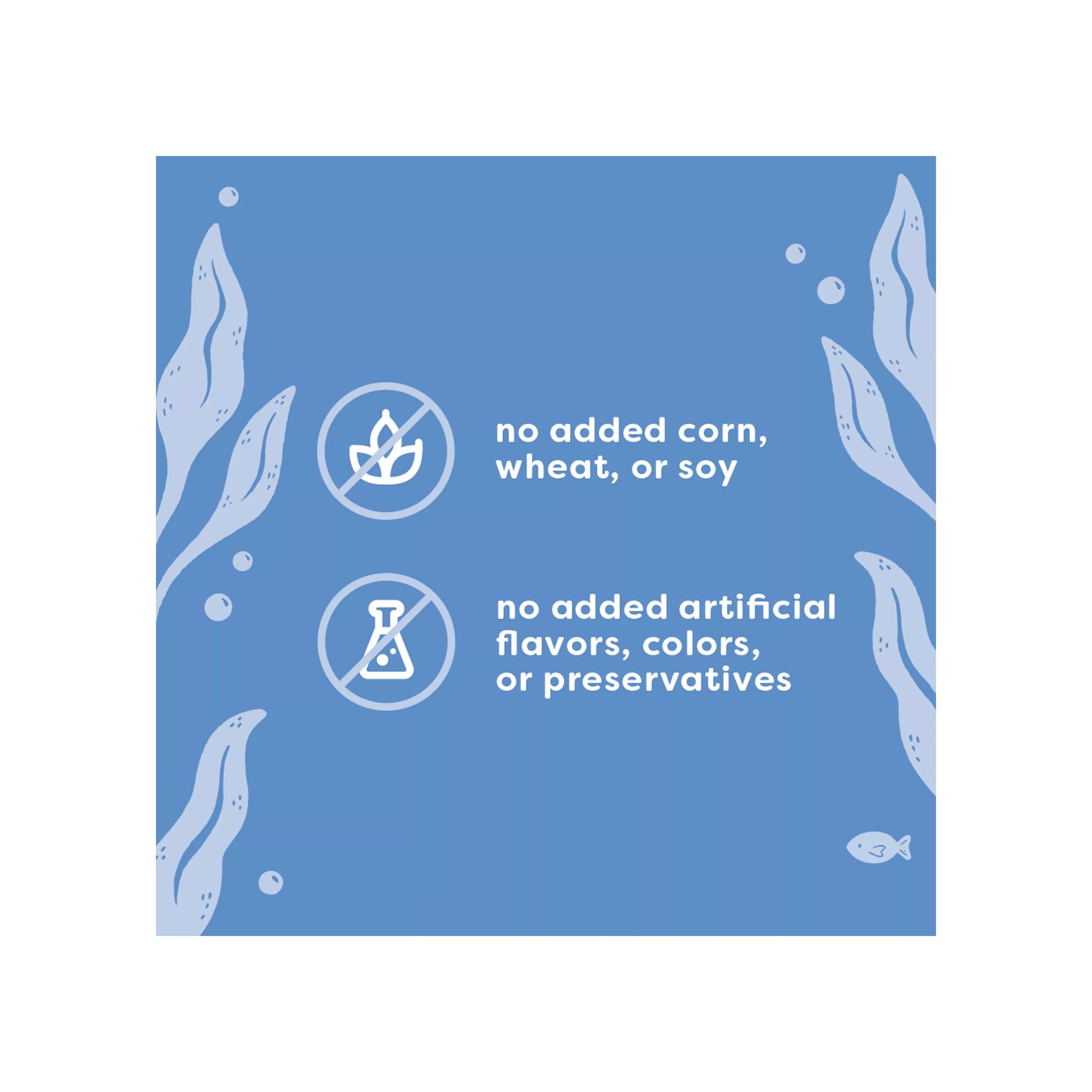 Caldo de pescado, atún, salmón, aceite de semilla de girasol, almidón de tapioca, lactato de calcio, copos de papa, sabor natural, goma guar, cloruro de colina, taurina, complejo de aminoácidos de zinc, fosfato tricálcico, cloruro de potasio, sulfato de magnesio, suplemento de vitamina E, niacina, complejo de aminoácidos de manganeso, suplemento de vitamina A, mononitrato de tiamina, pantotenato de calcio, sulfato ferroso, selenito de sodio, piridoxina (vitamina B6), ácido fólico, riboflavina (vitamina B2), sulfato de cobre, suplemento de vitamina K3, yoduro de potasio, biotina, suplemento de vitamina B12.