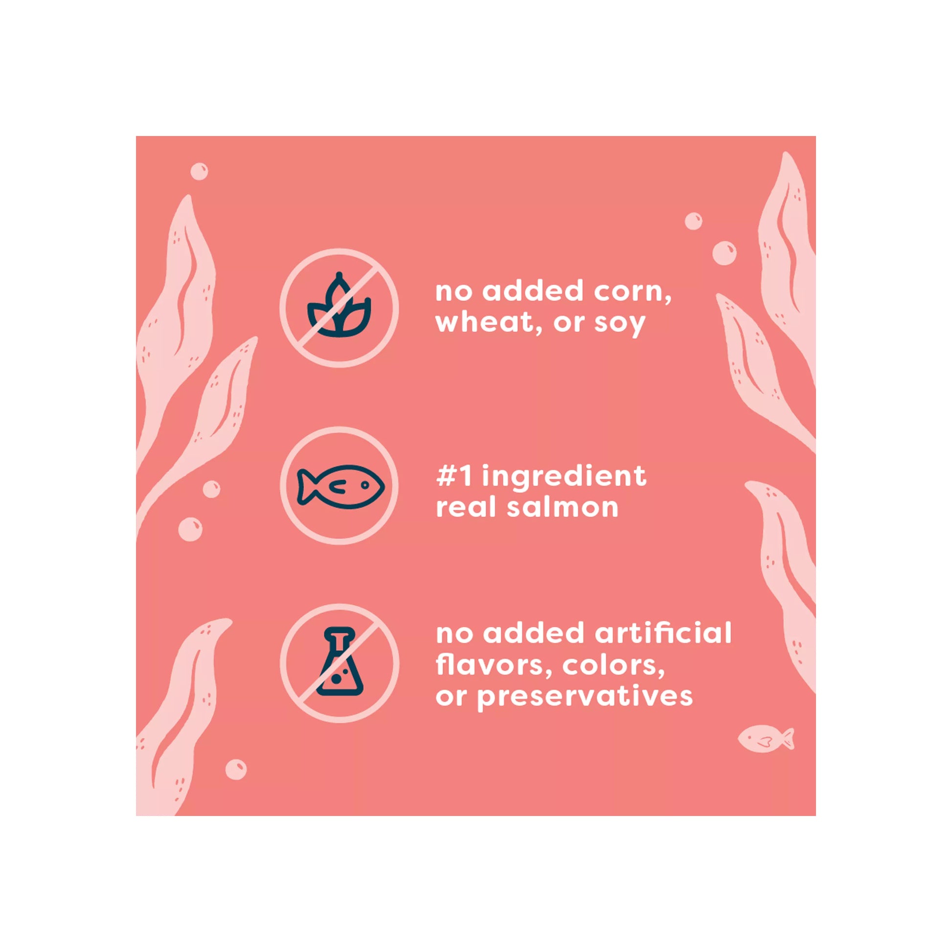 Salmón, pescado blanco, caldo de pescado, hígado de ave, corazón de ave, sabor natural, calabaza, goma guar, inulina, goma de casia, goma xantana, cloruro de potasio, sal, minerales (proteinato de hierro, proteinato de zinc, proteinato de cobre, proteinato de manganeso, selenito de sodio, yoduro de potasio), cloruro de colina, vitaminas (mononitrato de tiamina, suplemento de vitamina E, suplemento de niacina, suplemento de vitamina A, pantotenato de calcio, suplemento de vitamina B12, suplemento de riboflavina, clorhidrato de piridoxina, biotina, ácido fólico, suplemento de vitamina D3), taurina, carbonato de calcio.