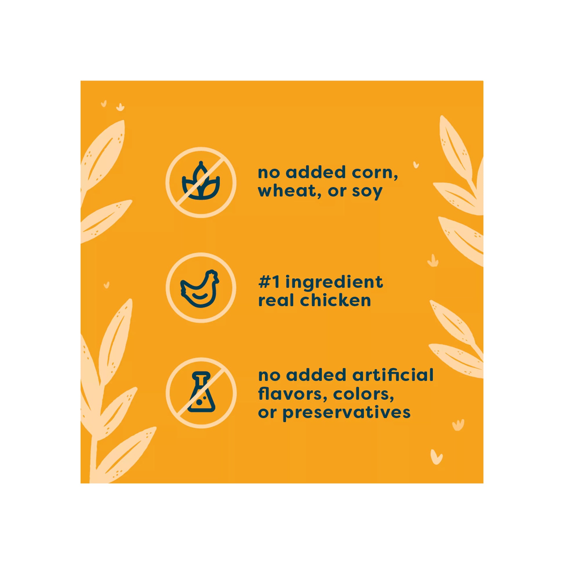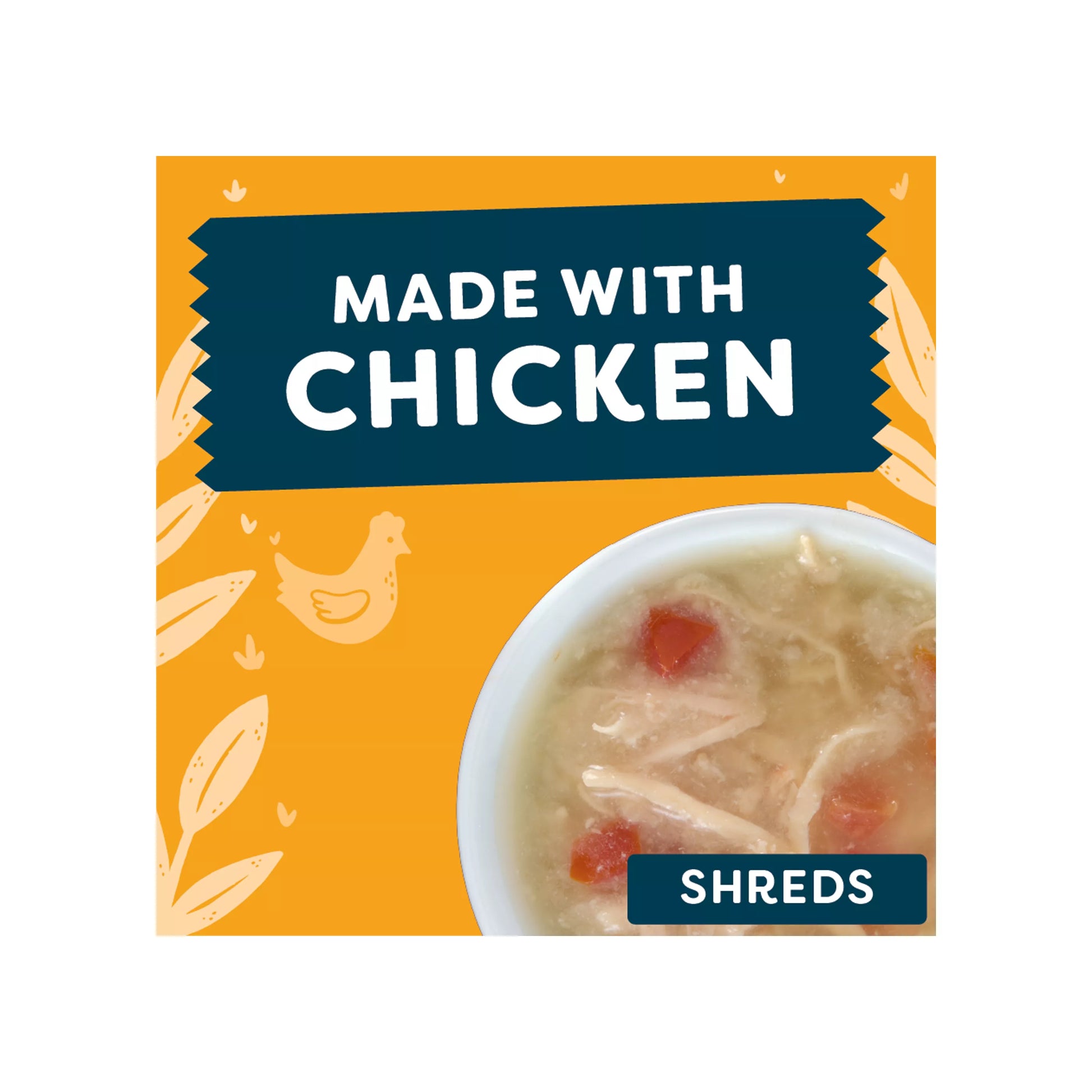 Pollo, caldo de pollo, agua suficiente para el procesamiento, tomate, aceite de semilla de girasol, almidón de tapioca, copos de papa, lactato de calcio, sabor natural, goma guar, fosfato tricálcico, sal, cloruro de colina, taurina, complejo de aminoácidos de zinc, cloruro de potasio, suplemento de vitamina E, niacina, complejo de aminoácidos de manganeso, sulfato ferroso, suplemento de vitamina A, mononitrato de tiamina, pantotenato de calcio, selenito de sodio, piridoxina (vitamina B6), riboflavina (vitamina B2), ácido fólico, suplemento de vitamina D3, sulfato de cobre, yoduro de potasio, biotina, suplemento de vitamina B12.