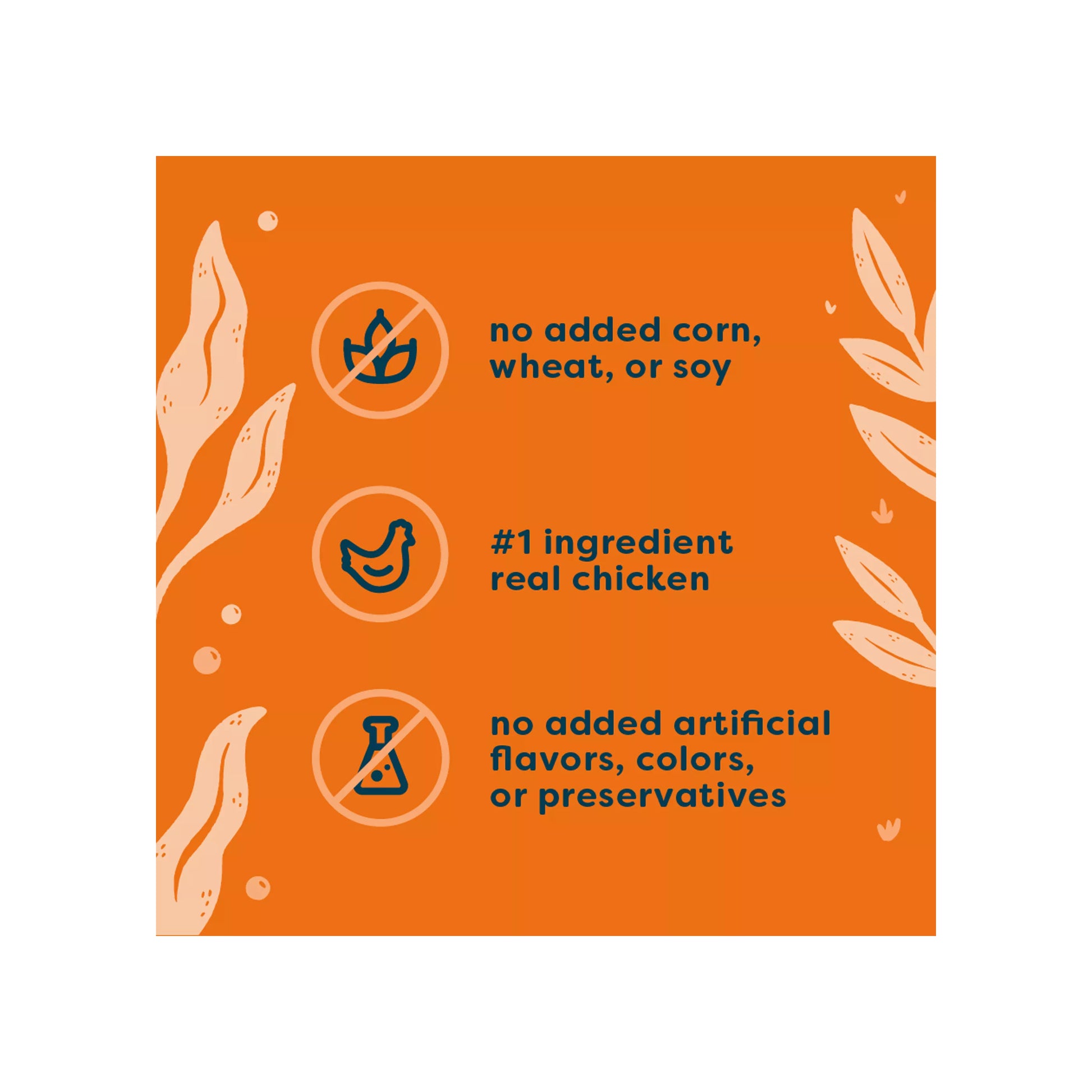 Pollo, caldo de pollo, hígado de ave, salmón, sabor natural, corazón de ave, calabaza, goma guar, inulina de achicoria, cloruro de potasio, sal, minerales (proteinato de hierro, proteinato de zinc, proteinato de cobre, proteinato de manganeso, selenito de sodio, yoduro de potasio), cloruro de colina, vitaminas (suplemento de vitamina E, mononitrato de tiamina, suplemento de niacina, suplemento de vitamina A, pantotenato de calcio, suplemento de vitamina B12, suplemento de riboflavina, hidrocloruro de piridoxina [vitamina B6], biotina, ácido fólico, suplemento de vitamina D3), goma de cassia, goma xantana, taurina, carbonato de calcio, sulfato de magnesio.
